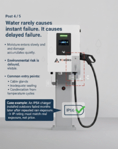 Poweris EV Charger Safety Series: What Really Causes Failures– Post 4 / 5 Water rarely causes instant failure.It causes delayed failure. Moisture enters slowly and damage accumulates quietly. →→
